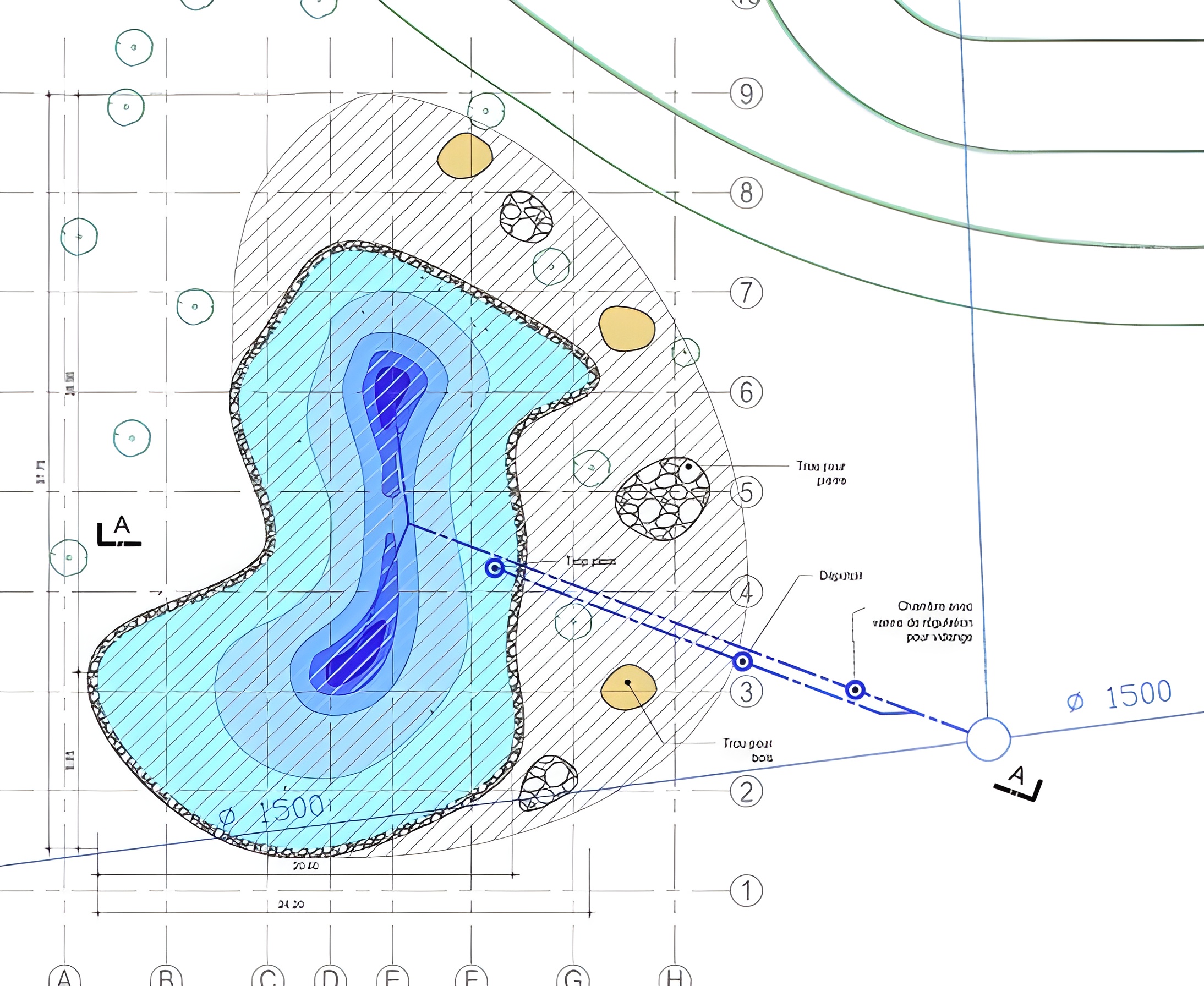 Réalisation de conduites de trop-plein et vidage avec chambres visitables et raccordement au réseau d’Eau Claire existant.